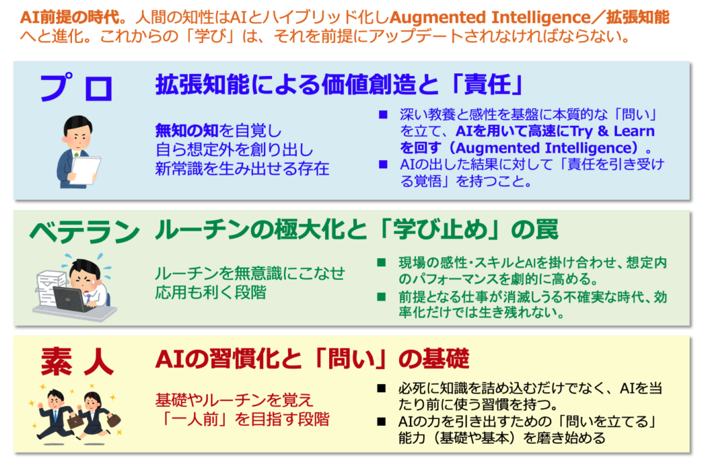 そして新しい常識を生み出すためには、確固たる基礎や基本、深く広い教養が必要です。その上で、AIによる「知的力仕事」を高速で繰り返し、Try and Learnを高頻度で回し続けることができる「Augmented Intelligence(拡張知能)」を自らの知性に組み入れていること。これが真のプロの条件です。