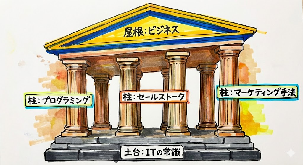 - 屋根(ビジネス): 柱の上に載る、あなたの仕事の成果や、プロフェッショナルとしての「信頼」です。