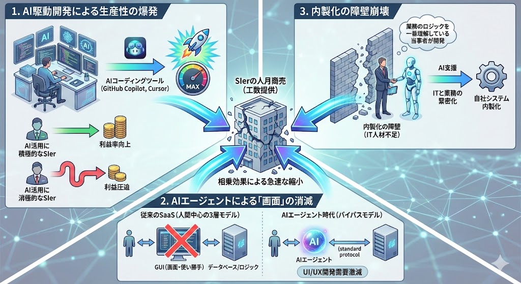 これまでSIerのビジネスモデルの根幹であった「人月商売(労働力の提供)」は、以下の3つの要因の相乗効果によって急速に縮小し、従来の収益構造は崩壊に向かいます。