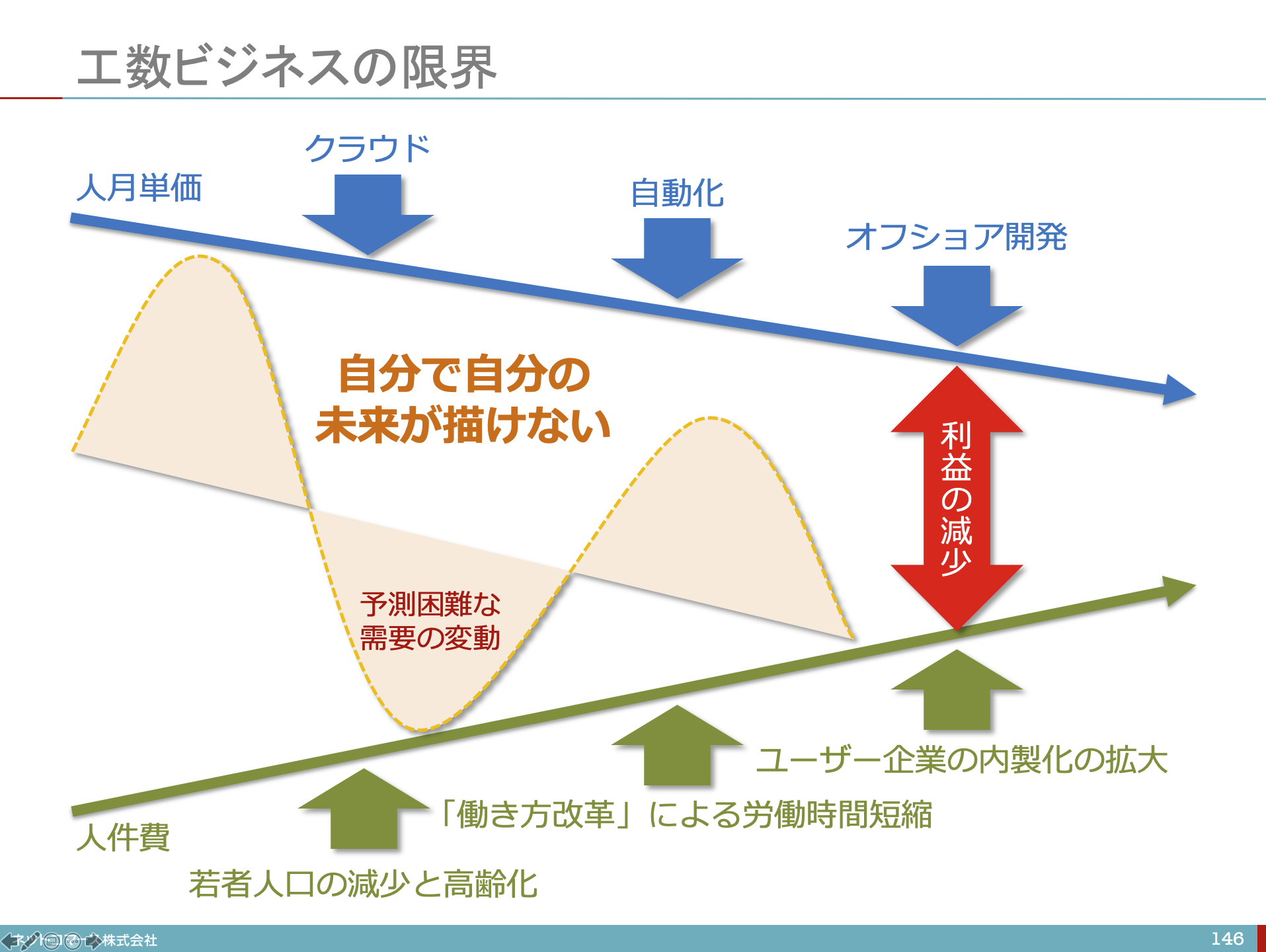 一方で、既存社員の高齢化が進めば給料を上げなければならず、黙っていてもコストは増えてゆきます。だからといって、いままでと同じ仕事のままで単金を伸ばす余地はありません。今後、クラウドや自動化が普及すれば、それらとの競合になるので、益々単金を上げることは難しくなってゆくでしょう。