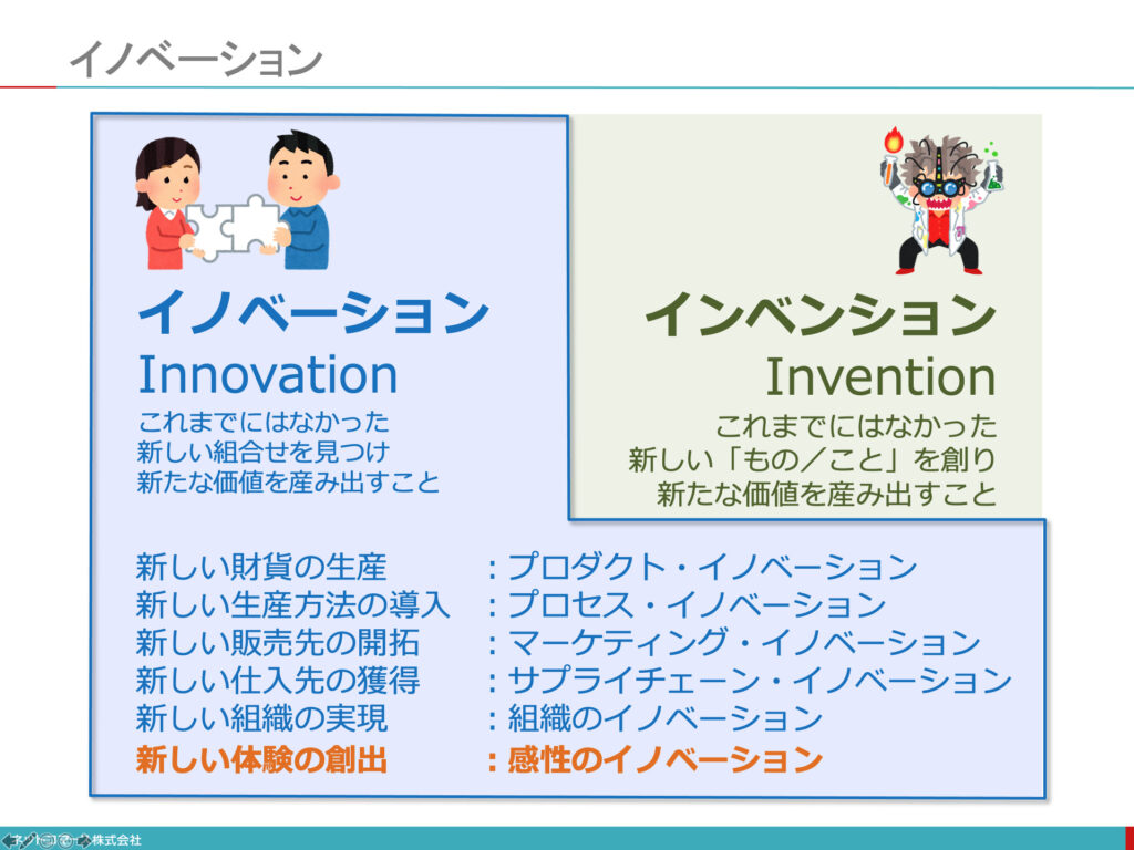 「イノベーション」は、「新技術を発明すること=技術革新」とは、異なる概念です。本来の意味は次のようになります。