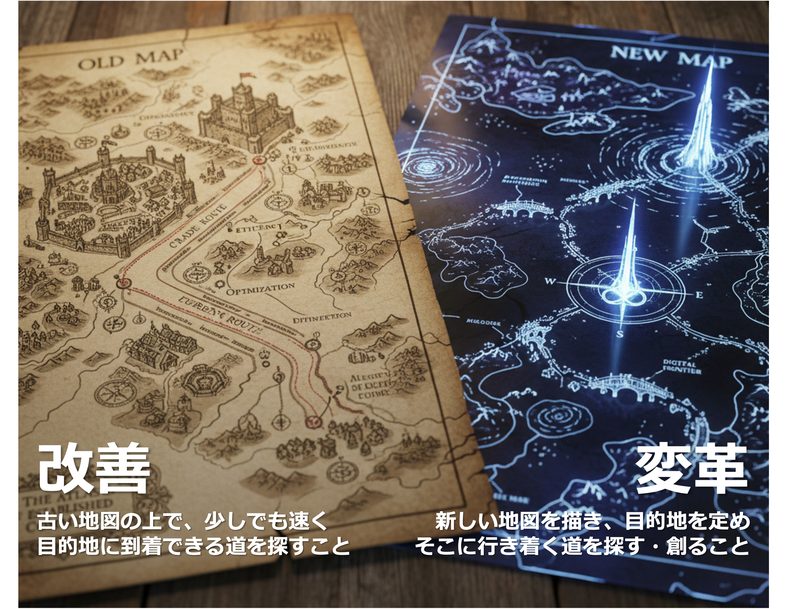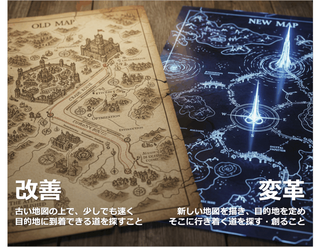 これまでの「古い地図」を頼りに目的地への最短ルートを模索することは、もはやできなくなろうとしています。AIという地殻変動によって、地図そのものが「新しい地図」に書き換わるからです。私たちは、その地図を自ら描き直し、その中に新たな目的地を定めなくてはなりません。古い地図の目的地はもう役に立たないのです。