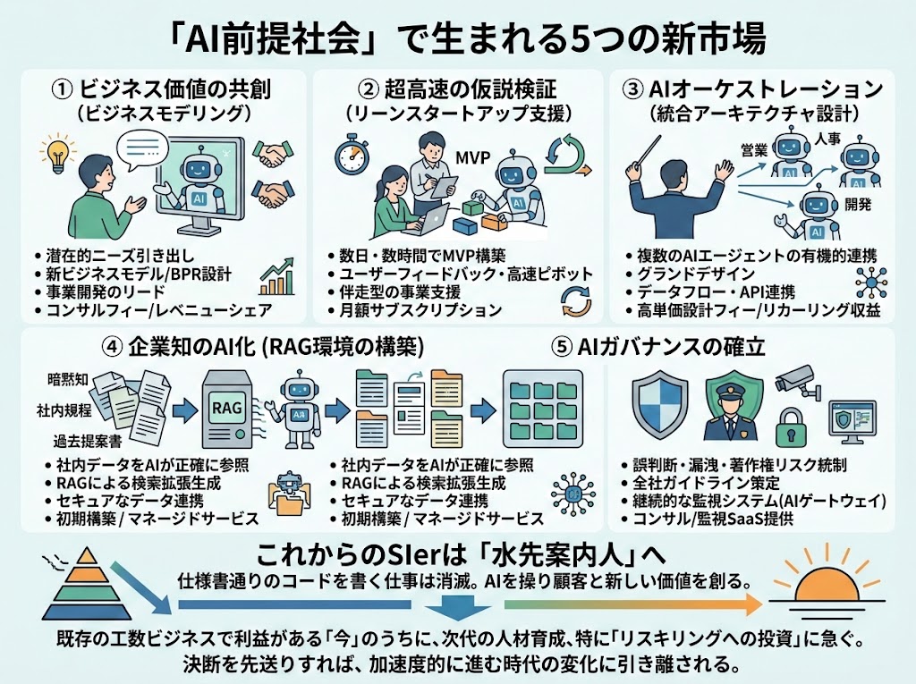 旧来の「工数需要」が消滅する一方で、AIを前提とした新たな需要が生まれます。これからのSIerが戦うべき主戦場は、以下の5つの領域になるでしょう。